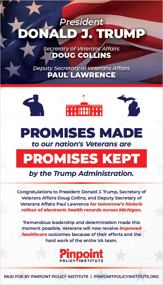 April 10, 2026 – Today, Pinpoint Policy Institute is running a full-page ad in The Washington Post congratulating President Trump, Secretary of Veterans Affairs Doug Collins, and Deputy Secretary of Veterans Affairs Paul Lawrence on tomorrow’s historic rollout of electronic health records across Michigan, a milestone in delivering on promises made to America’s Veterans.